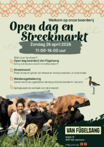 Er wordt verteld wat biologisch boeren inhoudt voor mens, dier en omgeving. In samenwerking met de Vogelwacht wordt je vanuit een mobiele kijkhut meegenomen in het verhaal van de weidevogels en hoe we deze, voor Friesland, belangrijke vogels kunnen helpen. En als je goed luistert en om je heen kijkt, kom je waarschijnlijk de ‘Kening van de Greide’ voorbij, de grutto. Naast het leren over de boerderij en de weidevogels, wordt er ook een streekmarkt georganiseerd. Zo’n 20 standhouders bieden hun streekproducten aan. De kinderen kunnen deze dag de kalfjes van dichtbij bekijken en er is een springkussen.
