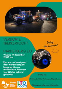 In Hardenberg wordt de verlichte trekkertocht gehouden op vrijdag 19 december 2025. De trekkers starten om 19.00 uur. Wil je meerijden met een mooi versierde trekker, geef je dan snel op, want vol = vol!